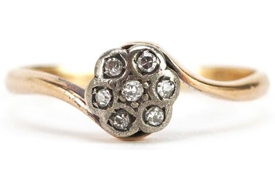 A 9ct gold ring set with black and white stones in a cluster setting. Ring size approx. O