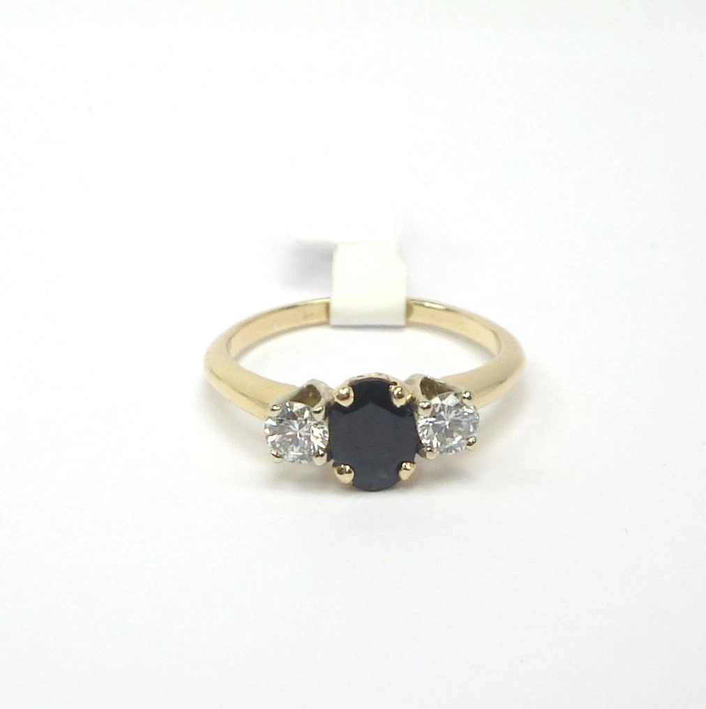 A 9ct gold ring set with central sapphire flanked by diamonds
